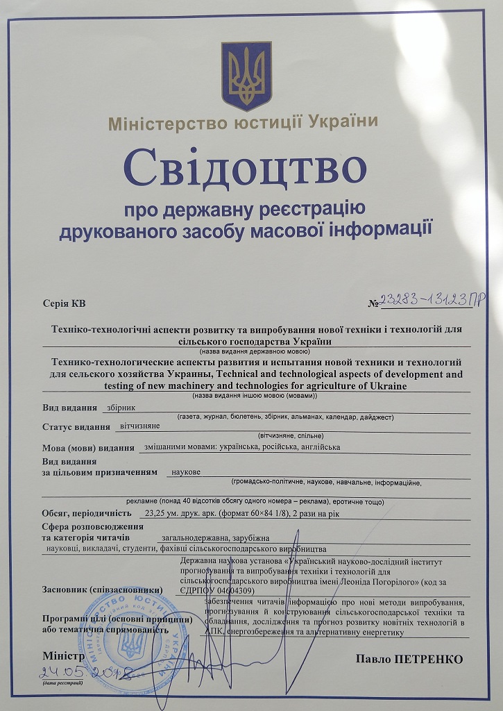 Видання внесене до Переліку наукових фахових видань України в галузях: технічні (спеціальність 133 - «Галузеве машинобудування») та сільськогосподарські (спеціальності: 201 - «Агрономія» та 208 - «Агроінженерія» ) науки.