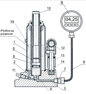 The basis for the design of devices ПВГ-5Е and ПВГ-10Е (Fig. 4) is a pallet jacks 1 carrying capacity under 5 tons and 10 tons. The platform 2 of each of the jacks has channel 3 between its outer surface and the surface that forms the bottom of the piston cavity 4 in the case 5 under a power piston 6. To the channel 3 on the outside of jack’s platform 2 via coupling 7 with hydraulic fluid leakage preventing valve and high pressure hydraulic hose 8 of required length electronic digital manometer 9 Servis Junior of Parker company production (Germany) on threaded connections with sealing gaskets is attached.