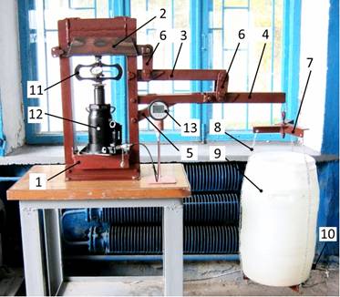 The installation consists of a frame 1, levers of first 2, second 3 and third 4 stages, holder 5, rods 6, traverse 7, slings 8, water vessel 9, the drain valve 10.