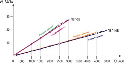 Dependence of fluid pressure in piston cavities of ПВГ-5Е and ПВГ-10Е devices on loads acting on the devices is illustrated in the diagram (Fig. 6), where the dynamics growth of fluid pressure with increasing loads and vice versa fluid pressure drop with a decrease in load is clearly traced.