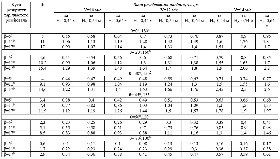 Після визначення швидкості відбитих від пластини насінин розраховуємо величину відскоку хпад насіння від точки удару по тарілчастій пластині без урахування сил опору повітря для гірчиці за змінних параметрів висоти установки та кута розкриття розсіювача. Дані представлені в таблиці 1.