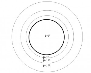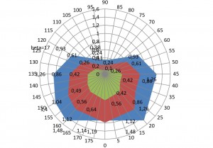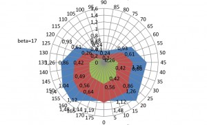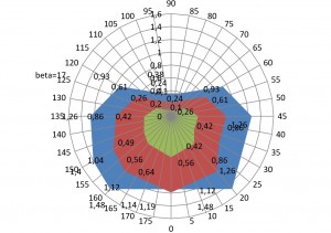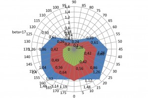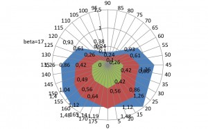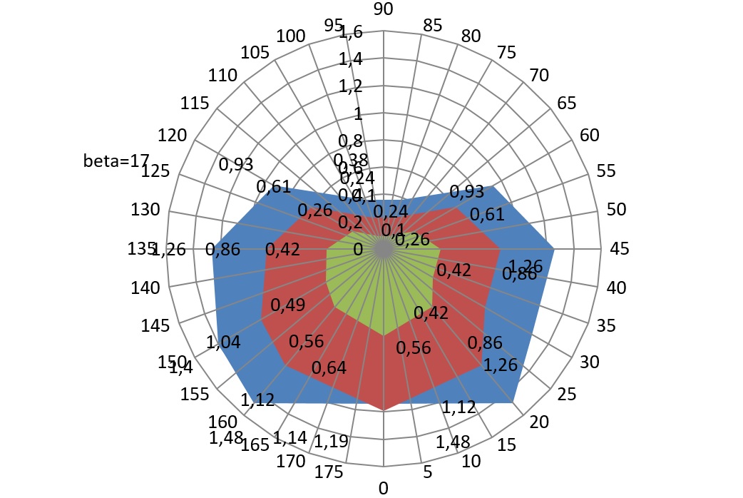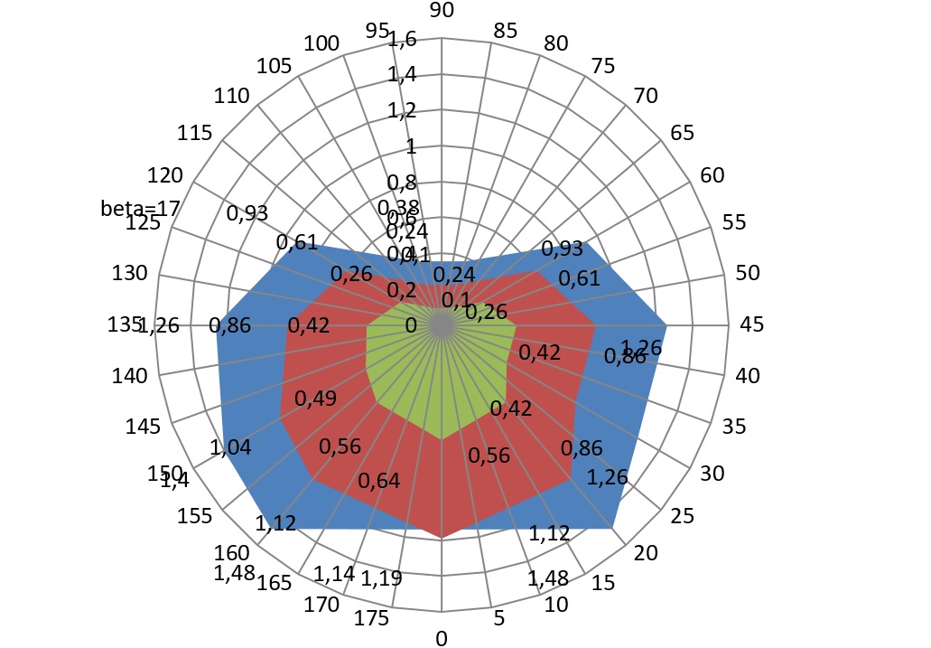 У горизонтальній площині хОу розрахуємо величину кута нахилу пластинки розсіювання відносно горизонтальної площини для цих насінин βθ за формулою \(\beta_\Theta = arctg({cos \Theta \cdot tg \beta})\), де за \(\Theta = 0^о\) дає: \(β_\Theta=β\), а за \(\Theta = ± 90^о\): \(β_θ=0\). Розрахувавши кут βθ, користуючись формулою \(\alpha=\beta_θ+ φ\), \(ψ=arctg({\frac{1}{k} \cdot tg(\beta_θ+ φ)})\), \(γ=\frac{\pi}{2}-(β_θ+ ψ)\), розраховуємо кути α, ψ і γ.