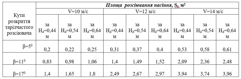 Таблиця 2 – Розрахункові дані площі розсіювання насіння гірчиці з урахуванням факторів впливу