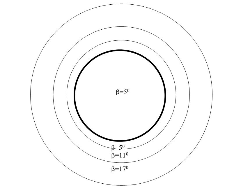 Визначаємо контури зони максимального розльоту насіння хпад, використовуючи формулу \(x_{пад} = V_0 \cdot cos \gamma \cdot ({V_0 \cdot sin \gamma + \sqrt{V_0^2 \cdot sin^2 \gamma + 2 \cdot g \cdot H}})/g\), в якій V0 обчислюється з урахуванням величини Vс, а також з огляду на зміну кута нахилу площини тарілчастого розсіювача β під час відскоку насіння в боки під кутами \(\Theta\) в горизонтальній площині хОу, відмінними від нульового 0о, тобто, в боки, відмінні від основного напрямку руху ҐПА.