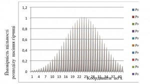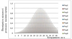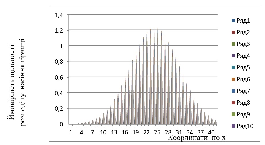 \(f_rr = \frac {1}{S_r}, \text{ якщо } x, y \in S_r \text{ та } f_{rr} = 0, \text{ якщо } x, y \notin S_r\), а щільність розподілу насіння по поверхні грунту можна інтерпретувати, як щільність нормального розподілу і визначаємо за формулою \(f_{ny}(y)=\frac{1}{\sigma_y\sqrt{2\pi}}exp(-\frac{(y-m_y)^2}{2\sigma_y^2})\), далі розраховуємо для кожної координати x, з площею Srі = 0,0025 м2 за допомогою побудови відповідної матриці розміщення насінин сидератів.