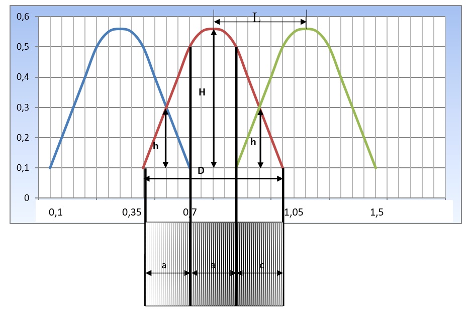 Зсуванням тарілчастих розсіювачів в поперечному до ходу агрегата напрямку забезпечується також зсування накладених епюр до досягнення висоти координати в точці перетину епюр рівною h і відповідною розміру половині медіани Н, яка характеризує густину ймовірності розподілу насіння по поверхні поля, при цьому витримується найбільш прийнятна для нашої ситуації рівномірність висіву, де а=в=с [ ].