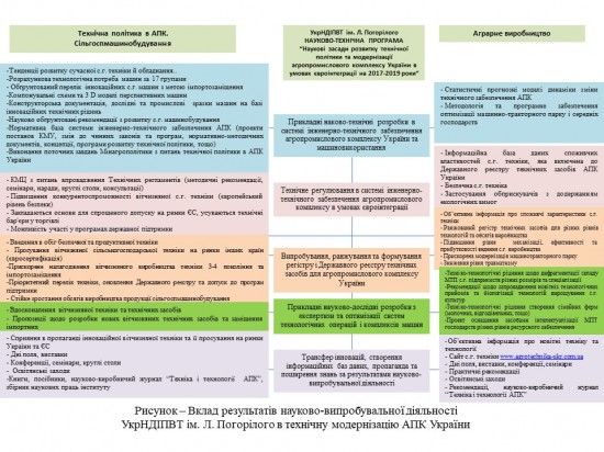 У відповідності до вимог часу УкрНДІПВТ ім. Л. Погорілого здійснює науково-випробувальну діяльність відповідно до Тематичного плану науково-випробувальних робіт за науково-технічною Програмою "Наукові засади розвитку технічної політики та модернізації агропромислового комплексу України в умовах євроінтеграції" на 2017-2019 роки (рисунок). Виконання Програми сприяє формуванню технічної політики в АПК України, розвитку сільськогосподарського машинобудування та аграрного виробництва.