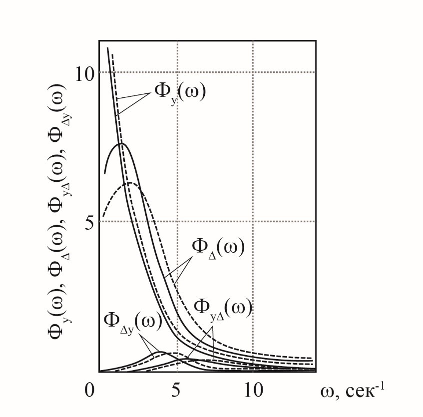 Енергетичні спектри впливу поздовжнього \(\Phi_У(\omega)\) і поперечного \(\Phi_{\Delta}(\omega)\) профілів дороги і взаємної кореляції \(\Phi_{У\Delta}(\omega)\) , \(\Phi_{\Delta У}(\omega)\) зображені на рис. 2: V=5 м/сек – суцільна лінія і V=8 м/сек – пунктирна.