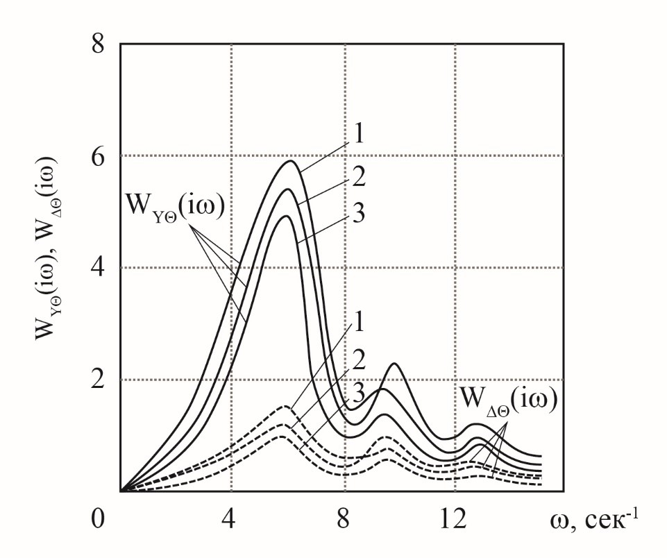 Криві частотних характеристик від поздовжнього \(WY\Theta(I\omega)\) і поперечного \(W\Delta\Theta(I\omega)\) профілів дороги до поздовжньо-кутових коливань корпусу гусеничного тягача (рис. 3) мають три максимуми, які обумовлені власними частотами повздовжньо-, поперечно-кутових і вертикальних коливань тягача. Значення модульних частотних характеристик (рис. 3), як лінійної системи, із запізненням змінюються зі зміною швидкості руху і показують сприйнятливість тягача до коливань в широкому діапазоні частот.