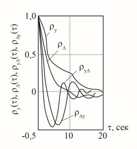 За центрованим графіком, за дискретними даними були підраховані нормовані автокореляційні функції поздовжнього \(\rho_{У}(\tau)\) і поперечного \(\rho_{\Delta}(\tau)\) профілів, а також взаємно-кореляційні функції між ними \(\rho_{У\Delta}(\tau)\) і \(\rho_{\DeltaУ}(\tau)\) (рис. 1) для одиничної швидкості.
