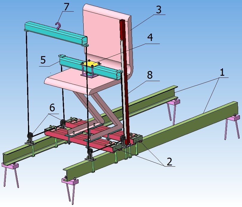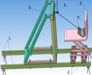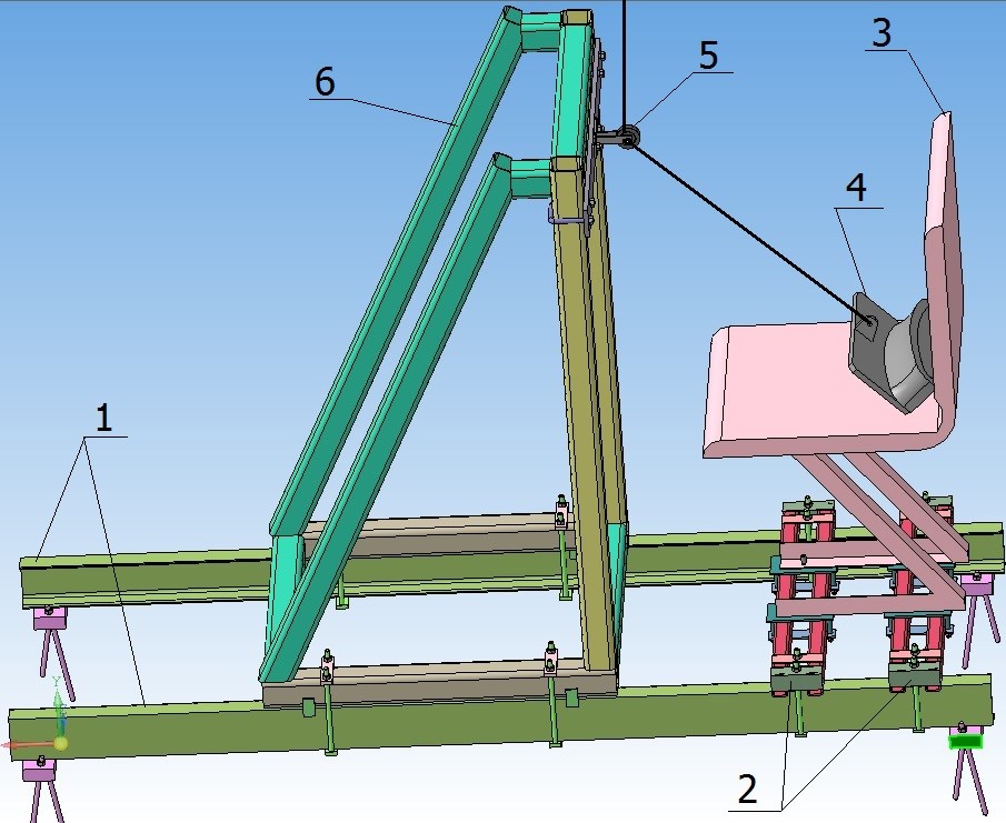 На силову підлогу закріплена рамка 2, на рамці розміщене сидіння 3. На сидінні за допомогою ременів безпеки закріплений пристрій для створення навантаження 4. До вуха пристрою закріплений трос. Трос проходить через блок 5, закріплений на рамній конструкції 6. Блок забезпечує зміну кута навантаження пристрою 4 з вертикального до 45 градусів. Після блока трос кріпиться до динамометра, приєднаного до ручного поліспаста.