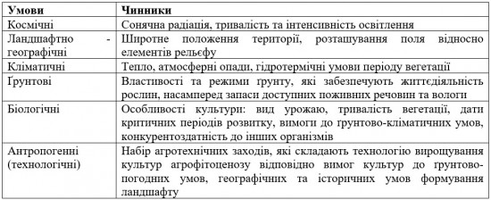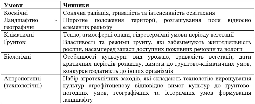 Формування урожаю органічної речовини (біомаси) рослин відбувається в результаті взаємодії різних чинників, які за своїм походженням мають різну спрямованість і за цією ознакою об’єднуються в різні умови, що наводиться в таблиці 2.