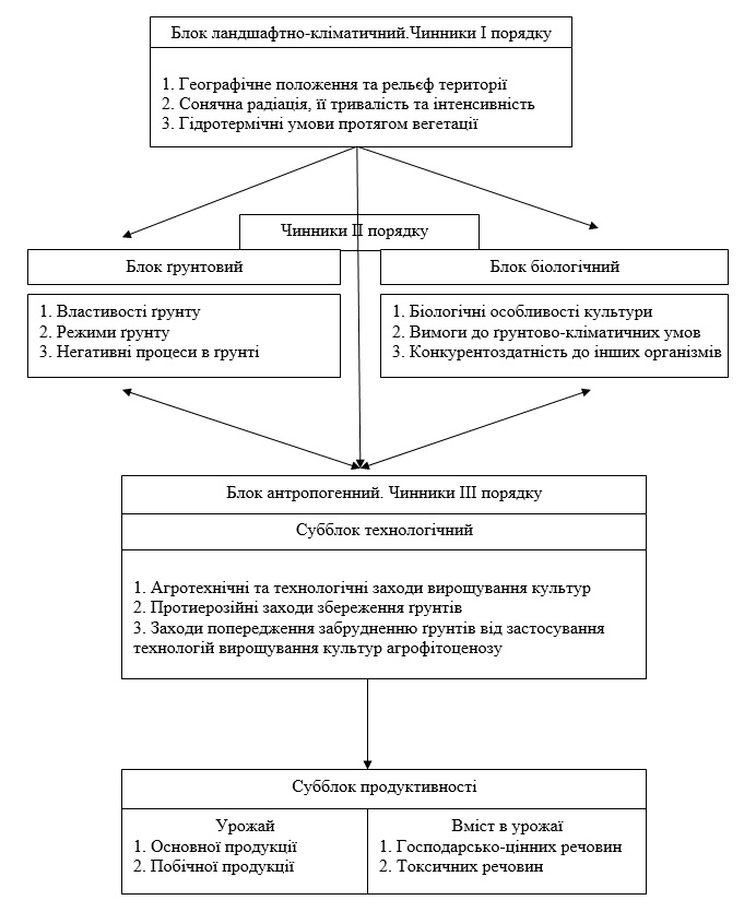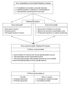 За впливом на природні чинники технологічних умов вирощування культур нами проведено їх ранжування, а також розроблена схема, яка показує систему взаємозв’язків чинників різних умов формування урожаю біомаси (рис. 1). Ці чинники об’єднуються у блоки за походженням.