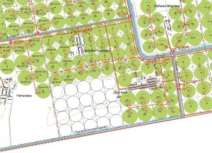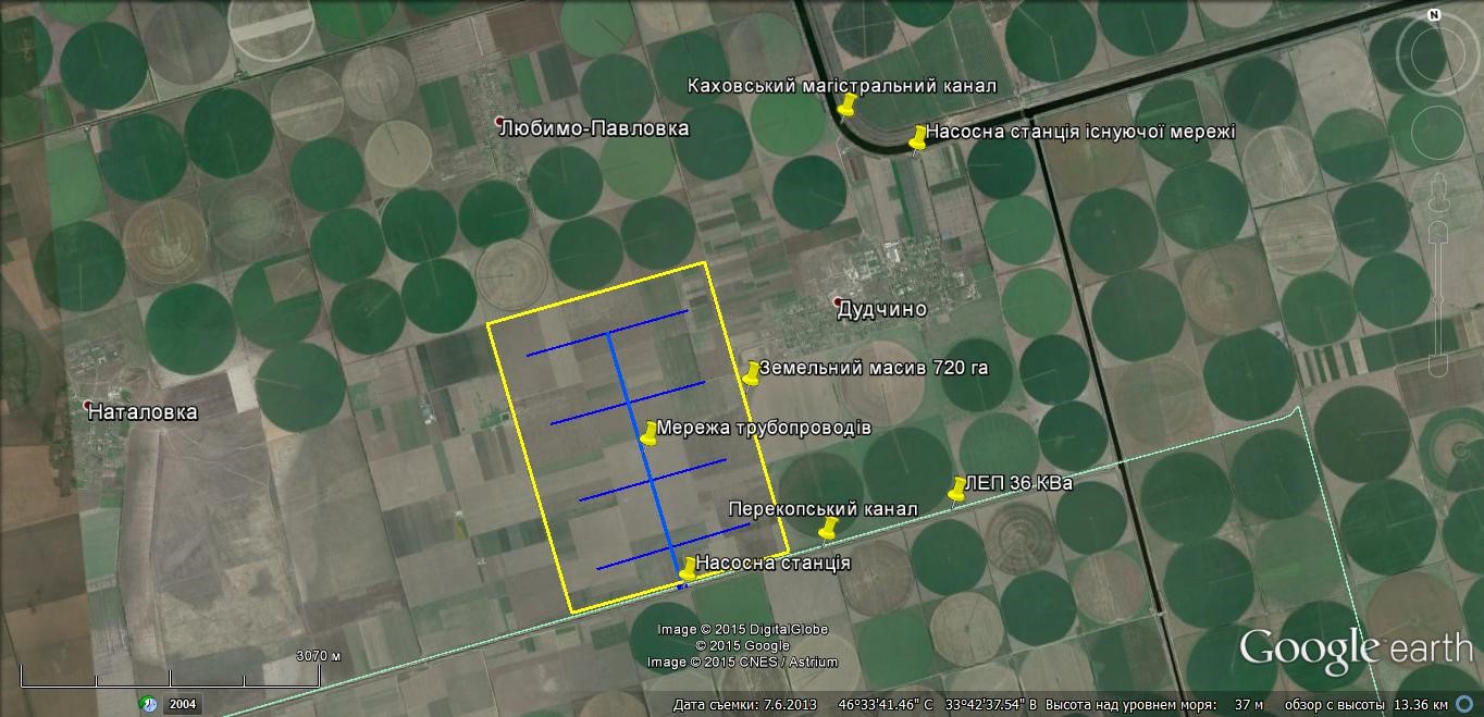 На основі аналізу космічних фото поверхні Землі – території розміщення зрошуваних земельних масивів мережі Каховського магістрального зрошувального каналу (рис.1), аналізу проектного плану розширення площ зрошуваних земель (рис.2) і моніторингу вибраного масиву на місці визначений як перспективний земельний масив (рис.3) з такими характеристиками.
