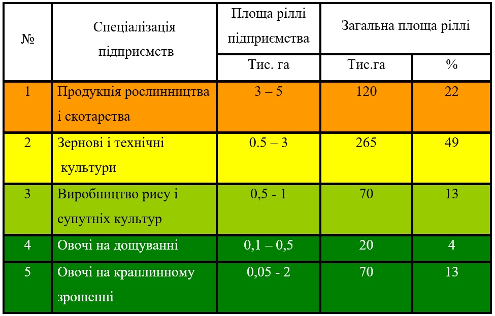 Як видно із представлених матеріалів, найбільш поширеною спеціалізацією господарств на зрошуваних землях є вирощування зернових і технічних культур. За таких умов площі ріллі названих господарств коливаються в межах 0,5-3 тис. га.