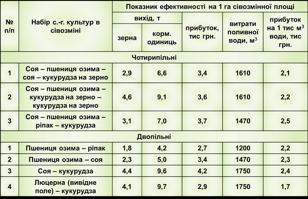 За дослідженнями фахівців Інституту зрошуваного землеробства НААН в теперішній час на зрошуваних землях України знайшли поширення 2-4-пільні сівозміни які забезпечують прибуток в розрахунку на 1 тис м3/га поливної води від 1,7 до 2,5 тис грн., та мають різний рівень водопотреби (табл.2).