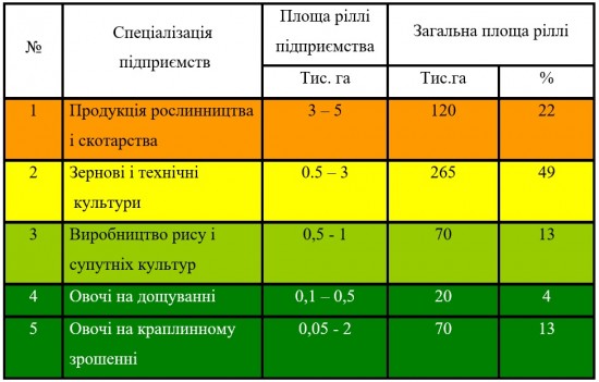 Таблиця 1 – Розподіл господарств зрошуваного землеробства півдня України за спеціалізацією та розміром ріллі.