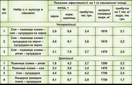 Таблиця 2 – Водоспоживання та ефективність сівозмін на зрошенні, за даними ІЗЗ НААН України