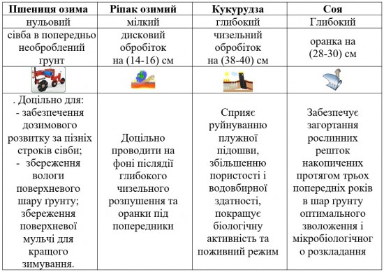 Відповідно до набору культур у визначеній сівозміні найбільш сприятливі умови для росту і розвитку сої формувалися за обробітку ґрунту з обертанням скиби на глибину 28-30 см, а для кукурудзи на зерно кращі умови забезпечувало чизельне розпушування на глибину 38-40 см.