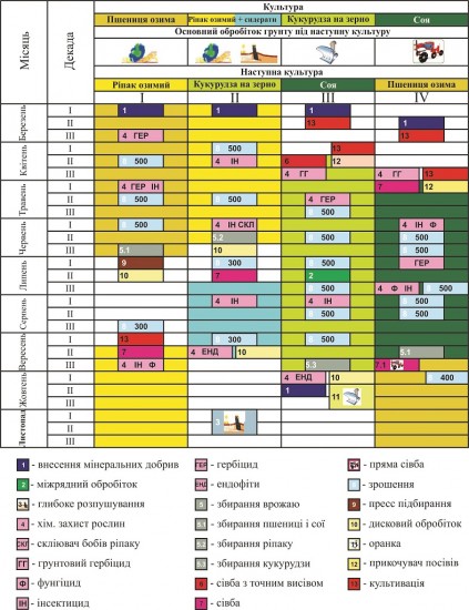 Що стосується технологічних заходів, пов’язаних з доглядом за пшеницею та ріпаком озимим в осінній період та за посівами кукурудзи та сої в весняно-літній період, то вони були загально визначеними.