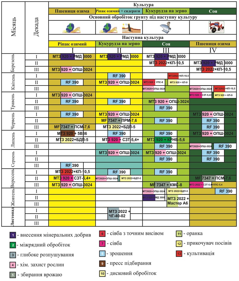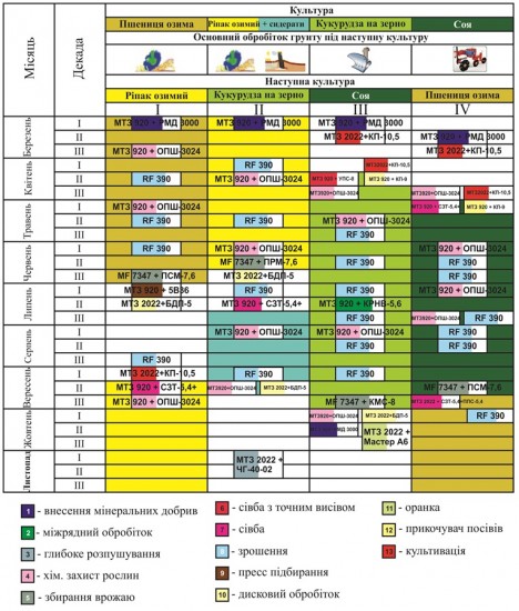 - графіка оптимальних агростроків виконання агротехнічних операцій у сівозміні; визначення добового завантаження машин (агрегатів) та врахування випадків збігу у декаді агротехнологічних операцій на різних культурах (табл. 2).
