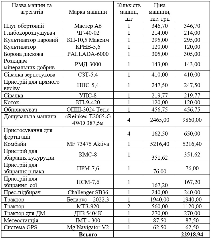 - створенню та експлуатації оптимального за складом та достатнього для забезпечення агротехнологій машинно-тракторного парку;