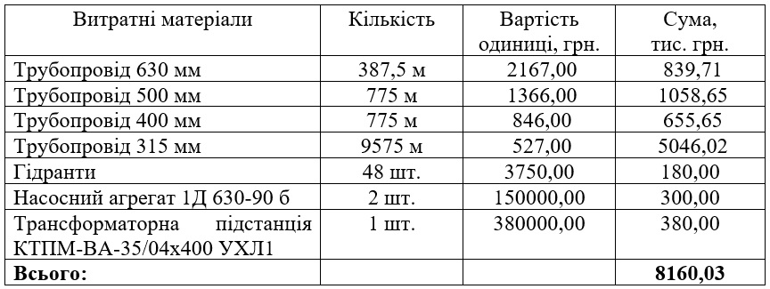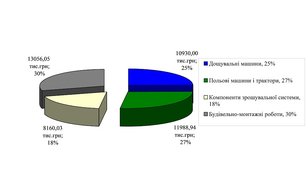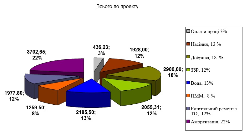 У проекті прийнято коефіцієнт 1,6, а це становить 13056,05 тис. грн. Отже сукупна вартість впровадження зрошувальної системи – 21216,08 тис. грн.