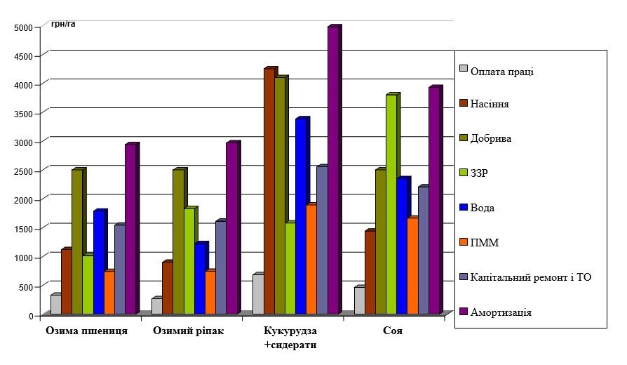 Рис. 4 - Структура загальних витрат на вирощування сільгоспкультур у сівозміні на зрошенні.