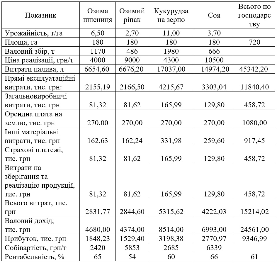 Ключові слова: машинно-тракторний парк, продуктивність, прямі експлуатаційні витрати, затрати праці, амортизація, собівартість, капіталовкладення, ефективність, рентабельність, строк окупності.