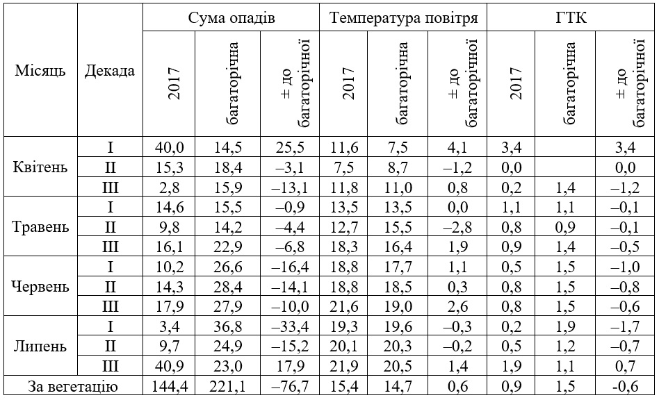 Виклад основного матеріалу. Агрометеорологічні умови 2017 року суттєво відрізнялися від середніх багаторічних даних за сумою опадів, їхнім розподілом протягом року, динамікою і величиною середньодобових температур (табл. 1).