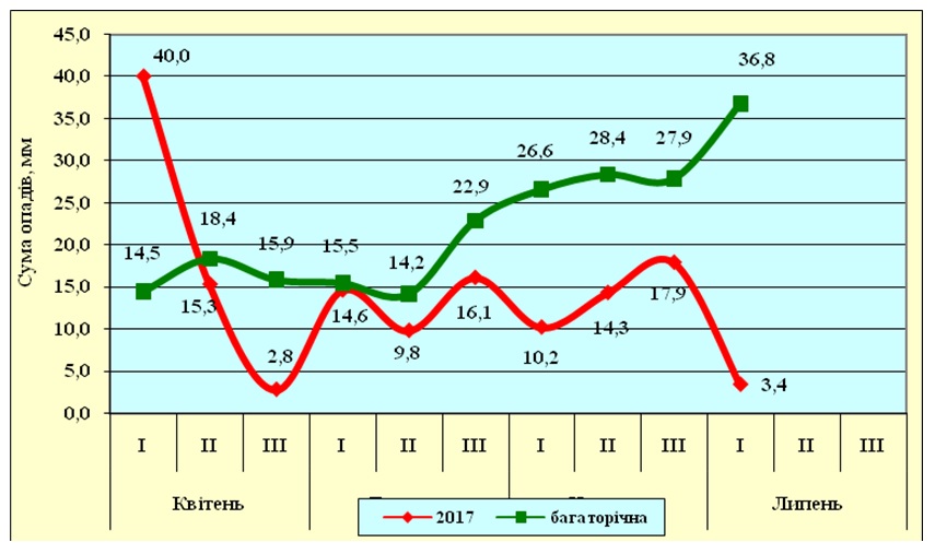 Ось, протягом 2017 року за сумою опадів середні багаторічні дані були перевищені лише в семи декадах, зокрема двох весняних та двох літніх. Слід відмітити повну відсутність опадів у двох декадах періоду досліджень, а