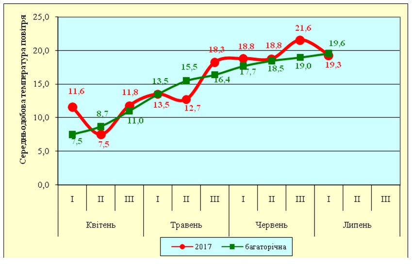 За середніми багаторічними даними, найбільша кількість опадів у зоні проведення досліджень припадає на літні місяці. У 2017 році дефіцит опадів за літні місяці склав 90,6 мм. За таких умов зволоження, в зоні проведення наших досліджень протягом 2017 року спостерігалися відхилення і температурного режиму (рис. 2)