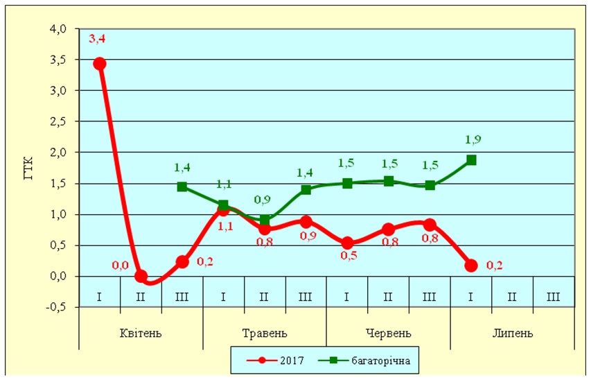 Аналіз даних, поданих на рисунку 3, дає підстави стверджувати, що в період сівби та появи сходів основних сільськогосподарських культур (кінець квітня – травень) гідротермічні умови 2017 року були задовільними. Подальший розвиток всіх культур як у вегетативну, так і в генеративну фазу, проходив в дуже посушливих та сухих умовах, коли ГТК Селянінова лежав значно нижче середніх багаторічних значень. За весь період вегетації 2017 року ГТК був вищим від середніх багаторічних значень лише у трьох декадах.