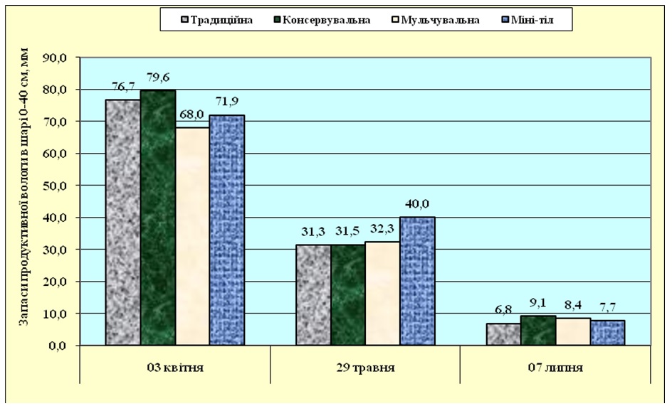 Протягом періоду вегетації вміст продуктивної вологи в орному шарі ґрунту змінювався в бік зменшення, незалежно від системи обробітку ґрунту (рис. 4), зважаючи на агрометеорологічні умови періоду вегетації, інформація про які наведена вище. В середині вегетації гороху, у фазі цвітіння, запаси продуктивної вологи в орному шарі ґрунту знизилися до критичних: від 31,3 мм за традиційного способу основного обробітку ґрунту до 40,9 мм – за використання міні-тілу. При цьому спостерігалася тенденція, обернена стану зволоження ґрунту на початку весняних польових робіт: кількість доступної вологи зростала за відмови від полицевої оранки і зменшення глибини обробітку.