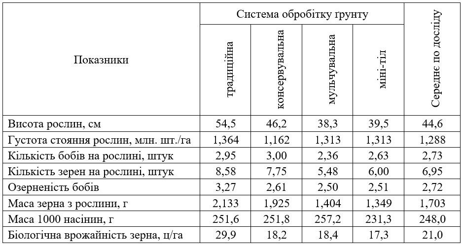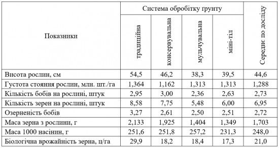 Саме застосування традиційної системи основного обробітку ґрунту сприяло формуванню найкращих показників структури врожайності гороху: висоти рослин, кількості бобів та їхньої озерненості.