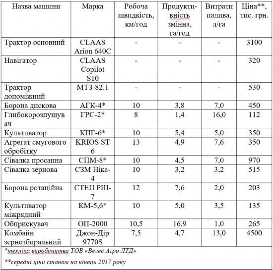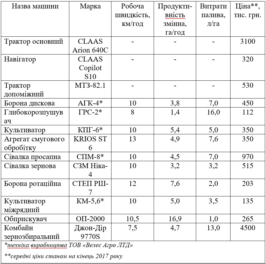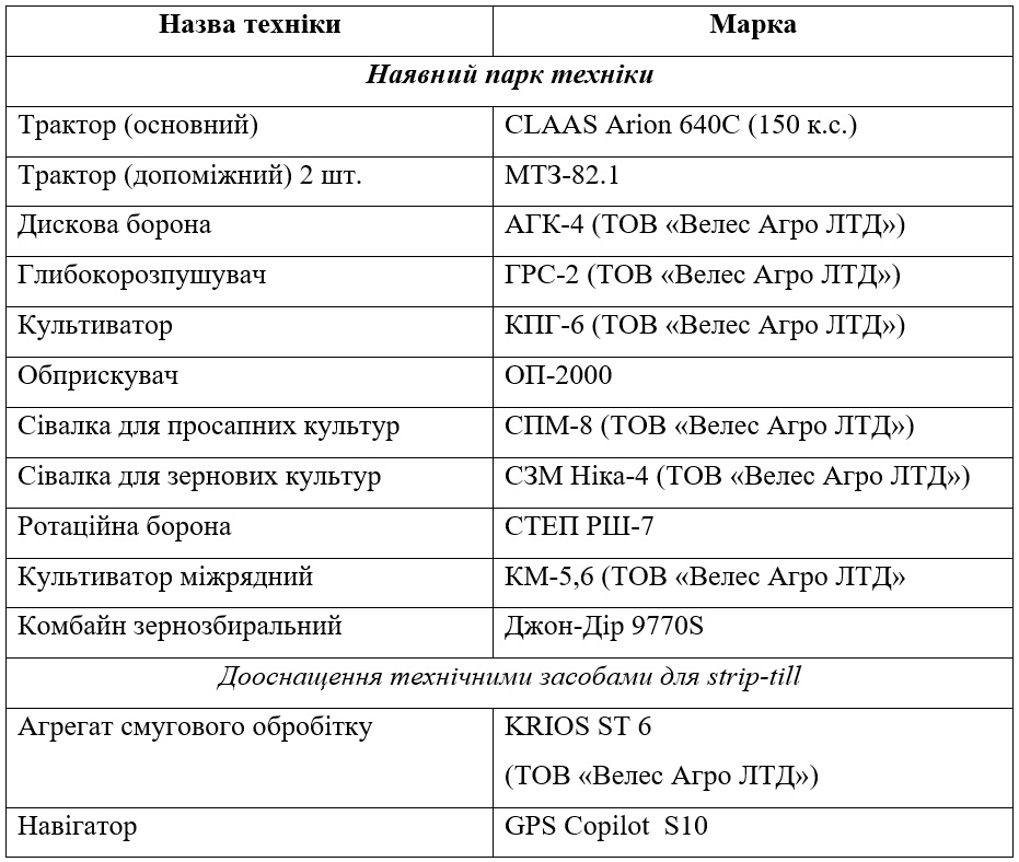 Впровадження технології strip-till потребувало дооснащення парку агрегатом смугового обробітку (виробництва ТОВ «Велес Агро ЛТД») та навігатором (таблиця 1)
