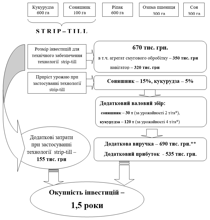 Завдяки підвищенню врожайності та, відповідно, зниженню собівартості виробництва насіння соняшнику і кукурудзи на основі застосування технології strip-till отримано додатковий прибуток. У випадку реалізації технології strip-till в господарстві площею 1000 га з п’ятипільною сівозміною (озима пшениця, кукурудза, соняшник, соя, ріпак) з інвестиціями 670 тис. грн та додатковими затратами на нову технологію в розмірі 155 тис. грн отримаємо додатковий прибуток 535 тис. грн, що дасть можливість окупити інвестиції за півтори року. Отже, технологія strip-till застосована під кукурудзу та соняшник в господарстві розміром 1000 га є загалом економічно вигідною для підприємства, призводить до отримання додаткового прибутку, а затрати понесені на дооснащення машинно-тракторного парку окупають себе за таких умов за 1,5 року.