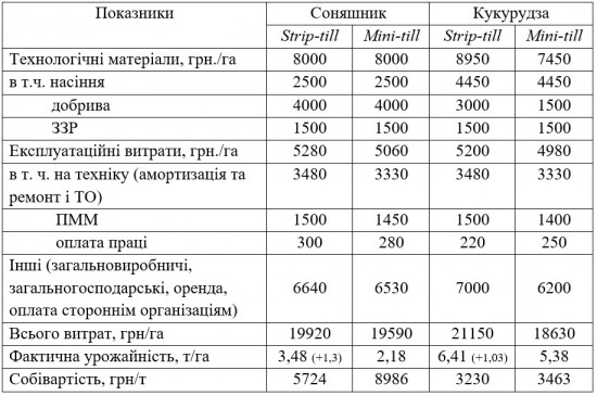 На вирощування соняшника витрати на насіння, добрива та ЗЗР у технології strip-till ідентичні з технологією mini-till, а на вирощування кукурудзи за технологією strip-till витрати на технологічні матеріали на 20% вищі порівняно з технологією mini-till. У структурі загальних витрат на вирощування соняшника та кукурудзи близько 25% займають витрати на експлуатацію техніки.