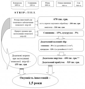 За счет повышения урожайности и, соответственно, снижения себестоимости производства семян подсолнуха и кукурузы на основе применения технологии strip-till получена дополнительная прибыль. В случае реализации технологии strip-till в хозяйстве площадью 1000 гектар с севооборотом (озимая пшеница, кукуруза, подсолнух, соя, рапс) при размере инвестиций 670 тыс. грн и дополнительных затратах на новую технологию в размере 155 тыс. грн получим дополнительную прибыль 535 тыс. грн, которая даст возможность окупить инвестиции за 1,5 года. Следовательно, технология strip-till применена под кукурузу и подсолнух в хозяйстве размером 1000 гектар является в целом экономически выгодной для предприятия, приводит к получению дополнительной прибыли, а затраты понесены на дооснащение машинно-тракторного парка окупают себя при данных условиях за 1,5 года.