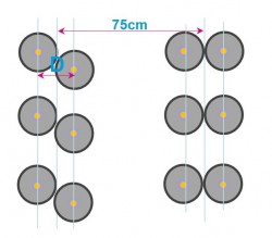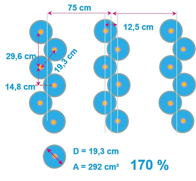 -Twin Row (відстань рознесення суміжних вузьких рядків 20 см, синхронізація зсуву насіння в суміжних рядках відсутня або можлива з допуском нечіткого додержання зсуву в межах половини інтервалу укладки).