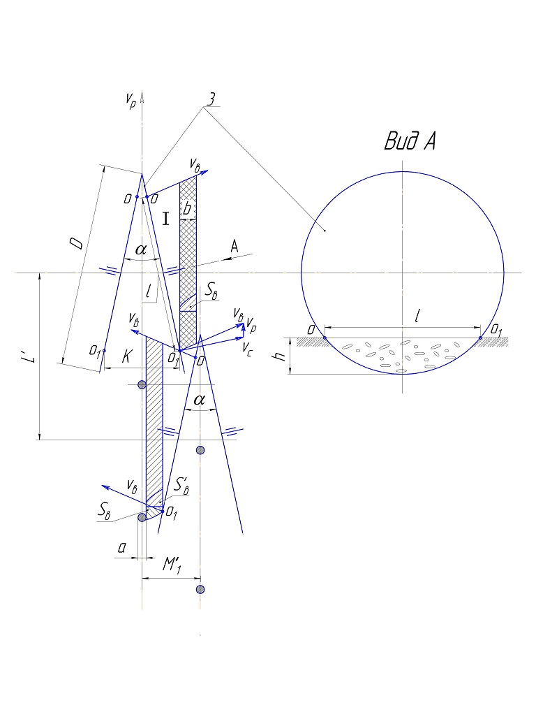 Рисунок 16 – Загальний вигляд розстановки суміжних пар секцій в сівалці з синхронізацією укладання насіння за шаховим типом: 3 – сошник; D – діаметр диска сошника; α – кут установки дисків сошника; L – глибина висіву насіння; Vв – результатний вектор від кидання ґрунту; Vс – вектор сколення ґрунту; VР – вектор руху сівалки; Sв – форма перерізу валка; b – ширина валка; І – зона ґрунту, яка зсувається частиною диска зануреного в ґрунті; К – відстань між сошниками в точках занурення в ґрунт; l – довжина хорди зануреного сошника в ґрунт на глибину h; a – розмір насінини; М'1 – рознесення суміжних в парі секцій