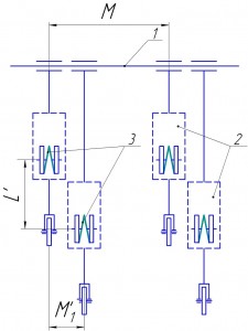 Рисунок 15 – Схематичне зображення компонування сівалки для сівби за шаховим типом: 1 – рама; 2 – посівні секції; 3 – дискові сошники; М – крок пар секцій; М'1 – рознесення суміжних у парі секцій